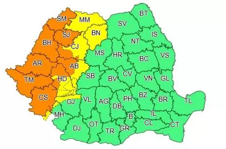 În județele Timiș, Arad, Bihor, Satu Mare, Sălaj, Caraș Severin, precum și în zona de munte a județelor Hunedoara, Alba și Cluj vor fi intervale cu intensificări puternice ale vântului (rafale de 80...90 km/h), vijelii, frecvente descărcări electrice și grindină.Pe arii restrânse vor fi averse torențiale și se vor acumula cantități de apă de peste 35...60 l/mp.