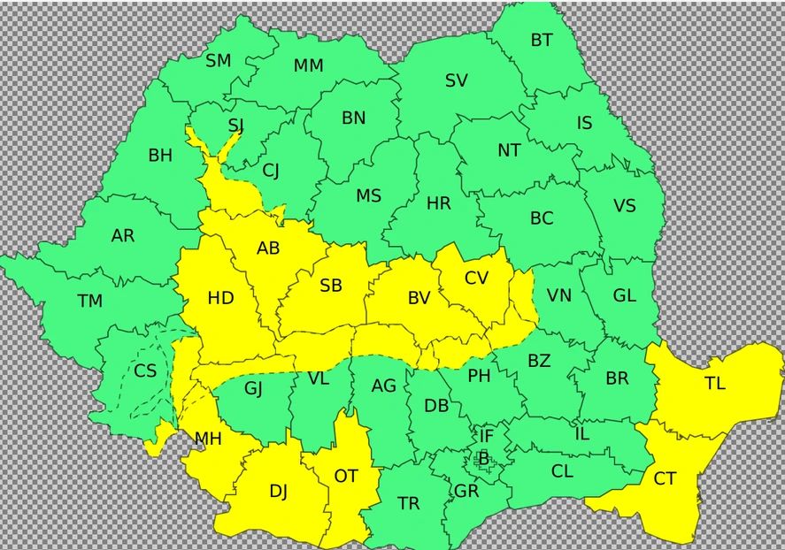 Pentru ziua de luni, în intervalul orar 12:00-22:00, ANM a emis Cod galben de vânt pentru mai multe regiuni, inclusiv Dobrogea, vestul și sudul Olteniei și zone din Transilvania, unde rafalele vor ajunge la 50-65 km/h.