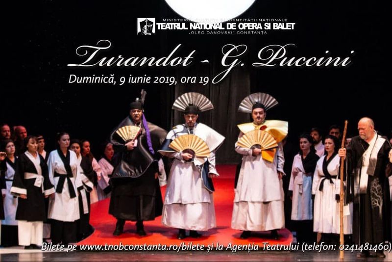 „Turandot”, duminică, 9 iunie, ora 19:00Duminică, 9 iunie, de la ora 19:00, este pusă în scenă reprezentația „Turandot” de Giacomo Puccini.Regia artistică îi aparține lui Alice Barb iar scenografia , Adrianei Grand. Sub conducerea muzicală a lui Koichi Inoue, pe scenă vor evolua soliștii: Elena Rotari, Răzvan Săraru, Nicoleta Ardelean, Constantin Acsinte, Doru Iftene, Marius Eftimie, Anton Zidaru, Florin Diaconescu, Cristian Caragea și Bogdan Ocheșel. Maestru cor: Adrian Stanache. Teatrul de Stat Constanța