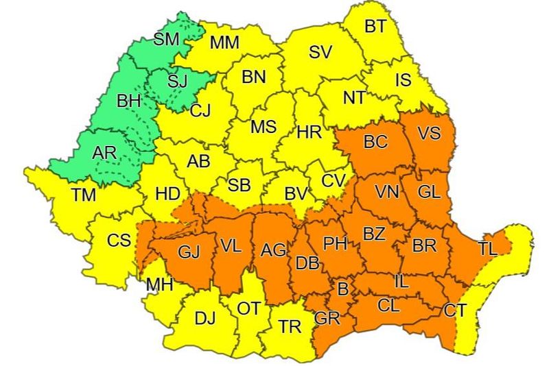 Vremea va fi instabilă. Vor fi averse ce vor avea și caracter torențial, descărcări electrice, grindină și intensificări ale vântului ce vor lua și aspect de vijelie. Cantitățile de apă vor depăși 25 l/mp și izolat 40-50 l/mp.