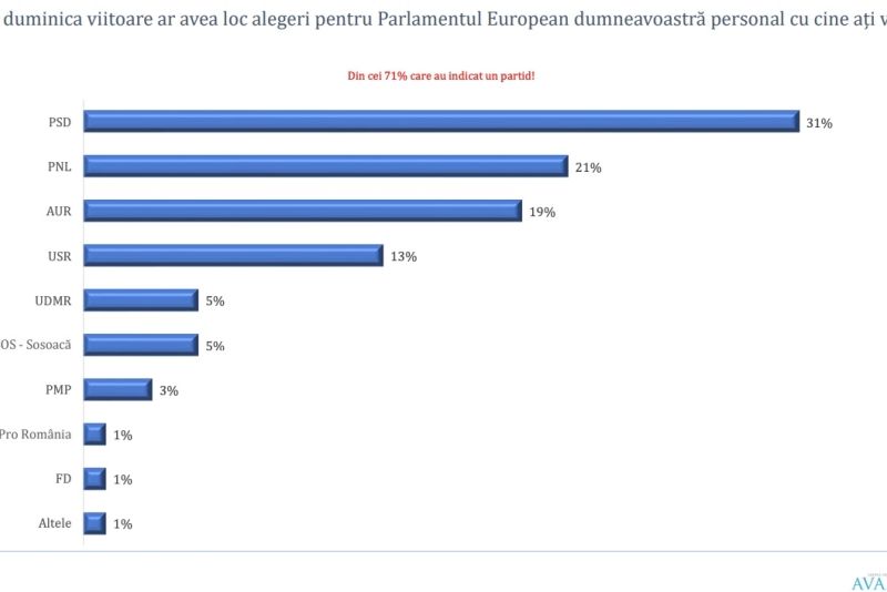 Un sondaj Avangarde făcut la comanda PSD arată că, dacă săptămâna viitoare ar fi alegeri europarlamentare, PSD ar fi votat de 31% dintre cei chestionați, în timp ce PNL are 21% de procente și este urmat la mică distanță de partidul extremist AUR, cu 19%.