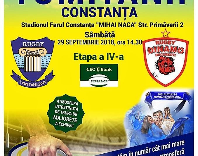 • ACS Tomitanii Constanța – Dinamo București - sâmbătă, 29 septembrie 2018, ora 14:30, stadionul „Mihai Naca”.Echipa de rugby Tomitanii Constanţa va juca sâmbătă contra echipei CS Dinamo Bucureşti iar atmosfera va fi întreținută de trupa de majorete a echipei. • Phoenix Știința Constanța – Universitatea Cluj Napoca – sâmbătă, 29 septembrie 2018, ora 18:00, Sala Sporturilor.Miercuri, într-o partidă contând pentru optimile de finală ale Cupei României la baschet feminin, echipa Phoenix Știința Constanța a reușit o victorie spectaculoasă, în fața Universității Cluj. Meciul retur dintre Phoenix – Știința Constanța şi Universitatea Cluj va avea loc sâmbătă, 29 septembrie, în Sala Sporturilor, formația constănțeană având prima șansă de calificare.