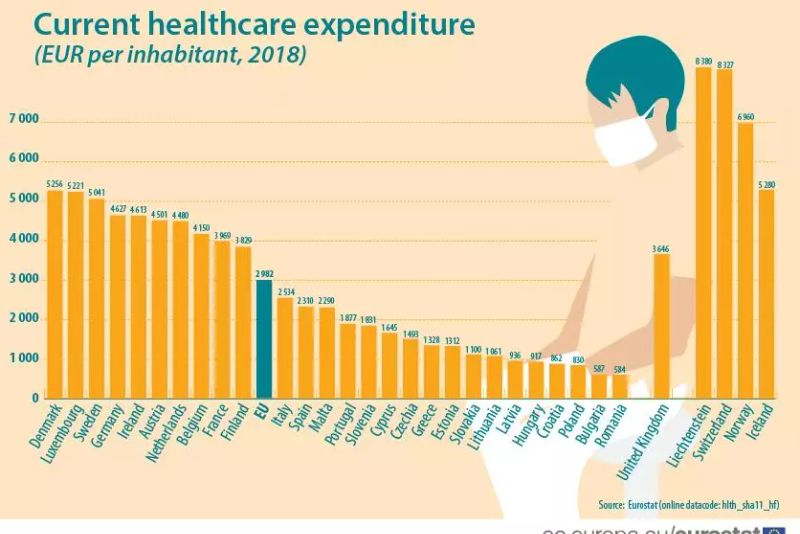 Țările din UE care alocă cei mai mulți bani cu sănătatea pe cap de locuitor au fost Danemarca (5.260 de euro), Luxemburg (5.220 de euro) şi Suedia (5.040 de euro).