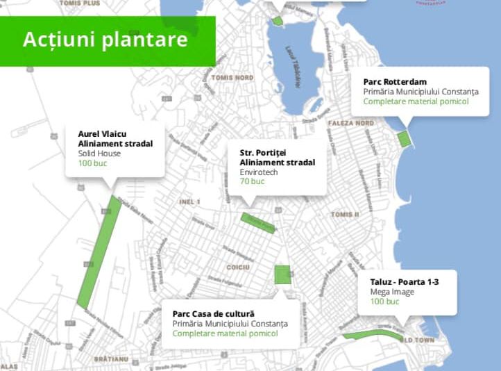 Potrivit Primăriei Constanța, în săptămâna 22 - 26 octombrie vor fi plantați 100 de plopi de tip Populus simonii pe malul lacului Siutghiol și 70 arbori din specia Catalpa bignonioides în aliniamentul stradal de pe Strada Portiței, reabilitată în primăvara acestui an.De asemenea, pe 27 octombrie va avea loc acțiunea voluntarilor Constanța Restart. Pentru a marca Anul Centenarului Marii Uniri, aceștia vor planta 100 de arbori în zona Ramada - Pavilionul Expozițional din Parcul Tăbăcărie. Exemplarele de arbori au fost alese diversificat, în vederea constituirii unor grupuri pe peluzele situate în apropierea lacului, din următoarele specii de foioase: plop de tip Populus simonii, salcie creață (Salix matsudana tortuosa), paltin de câmp (Acer platanoides), Catalpa bignonioides și o cincime de conifere: pin negru (Pinus nigra), ienupăr de Virginia (Juniperus virginiana).Acțiunile continuă și în săptămâna 29 octombrie – 3 noiembrie, când va fi completat aliniamentul stradal de pe bulevardul Aurel Vlaicu, tronsonul reabilitat, cu arbori din specia Acer pseudoplatanus (paltin).Cu sprijinul operatorilor comerciali invitați la dialog de către Primăria Municipiului Constanța, campaniile se vor derula și prin plantări de material dendrologic în zona intrării în stațiunea Mamaia dinspre Năvodari, respectiv pe taluzul dintre Poarta 1 și 2 de acces în Portul Constanța. „În toate aceste acțiuni, Primăria Municipiului Constanța prin Serviciul Gestionare Spații Verzi pune la dispoziția tuturor celor interesați sprijin logistic începând cu identificarea locațiilor de plantare, indicarea materialului dendrologic pretabil, transportul acestuia și pregătirea terenului pentru plantare, respectiv preluarea în întreținere a materialului plantat”, spun reprezentanții instituției.