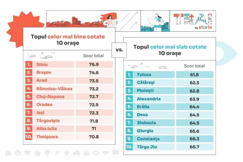 Orașul Tulcea se află pe primul loc în topul celor mai slab cotate orașe din România, cu un scor de 61,8 puncte, urmat de Călărași (62,3 puncte), Ploiești (62,8), Alexandria (63,9) și Brăila (64,4). De asemenea, cu un scor similar, de 64,5 puncte, se menționează orașele Slobozia și Deva. Ultimele trei orașe care se regăsesc în acest top sunt Giurgiu (65,6), Constanța (66,3) și Târgu Jiu (66,7).