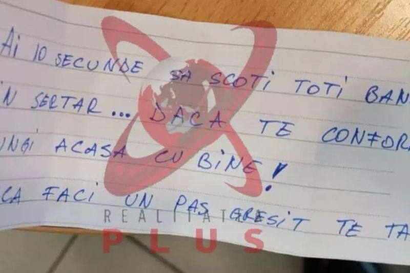 O bancă aflată în apropierea sediului central al Poliției Române, de pe bulevardul Ștefan cel Mare, a fost ținta unui jaf. Realitatea Plus a prezentat, în exclusivitate, imagini din camera de supraveghere care surprind momentul jafului, precum și mesajul scris pe bilet.
