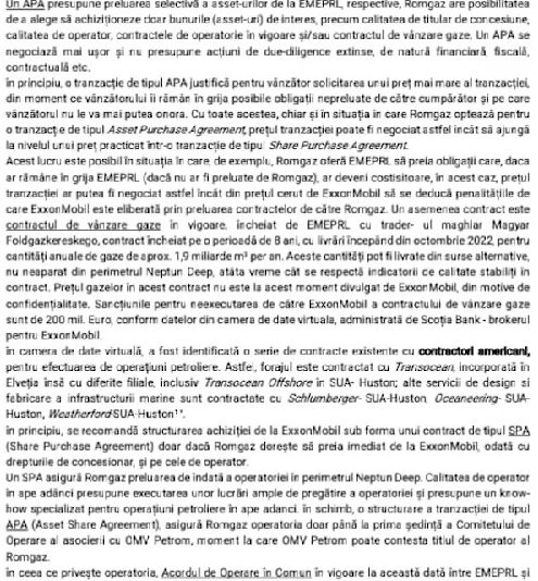 „Și acum... bomba. În 10 decembrie 2020, cu cateva saptamani înainte să fie schimbat de la conducerea companiei, directorul general Romgaz îi scrie o scrisoare lui Virgil Popescu, ministrul Energiei, în care îi spune: Ai de ales între două chestiuni - să cumpărăm acțiunile societății Exxon MBRL sau să cumpere unele active ale Exxon Mobile, care sunt legate de această explorare, adică dreptul de a exploata zăcământul, zăcământul rămâne al statului, e proprietate publică. Dl Volintiru (Adrian Volintiru, n.r.) îi spune ministrului Popescu ce înseamnă dacă va cumpăra Romgaz acțiunile acestei firme Exxon Mobile. Înseamnă că va cumpăra niște obligații pe care Exxon Mobile le are.
