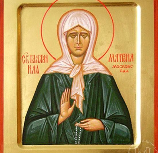 Sfânta Matrona s-a născut în anul 1881, în satul Sebino din ţinutul rusesc Tula.Din naştere a fost lipsită de vedere, iar copiii adesea o batjocoreau. Locuia în apropierea bisericii satului și mergea la toate slujbele. Pe când avea 17 ani, Sfânta Matrona nu a mai putut merge. Din acea clipă a stat tot restul vieţii mai mult întinsă pe pat, îndeletnicindu-se cu rugăciunea, postul şi mângâierea celor care îi treceau pragul, veniți pentru a primi izbăvire de necazuri şi vindecare de boli.În data de 2 mai 1952, s-a mutat la Domnul, iar în ziua de 8 martie 1998, au fost descoperite moaştele sale nestricate, răspândind bună mireasmă, care au fost aşezate în mănăstirea „Acoperământul Maicii Domnului” din Moscova. Pe 2 mai 1999, fericita Matrona a fost trecută în rândul sfinţilor de către Biserica Rusiei.