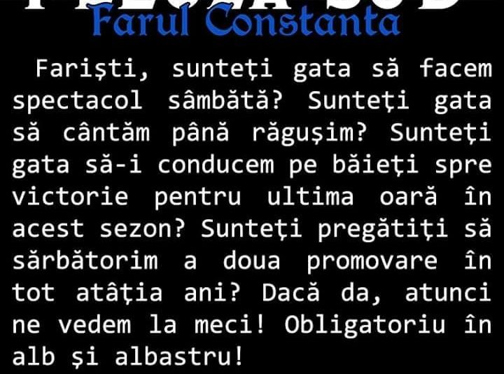 Peluza Sud Farul Constanța cheamă fanii la stadion pentru meciul de sâmbătă, 26 mai, ora 18.00 dintr SSC Farul Constanța și Sportul Chişcani. Suporterii au pornit o campanie prin care speră să aducă un număr mare de susţinători la partida care va aduce promovarea în Liga a 2 a.Apelul postat pe pagina de facebook FC Farul Constanța:„La începutul proiectului Suporter Spirit Club Farul ne doream cu toții 3 promovări consecutive! Sămbătă, cu un meci egal promovăm şi sărbătorim cea de-a doua promovare în 2 ani! Vrem însă victoria şi ne dorim ca echipa noastră să facă spectacol! Ne dorim un stadion plin ca să ne bucurăm pe deplin! Alt obiectiv important a fost dat de dorința noastră! Ne-am dorit să nu lăsăm spiritul farist să moară! În aceşti 2 ani mulți dintre voi ați reînvățat să vă iubiți echipa favorită şi să vă bucurați alături de Farul! Asta ne face măndri şi ne arată că am ales drumul corect!Iubirea noastră, a tuturor, va duce Farul acolo unde ii este locul! Vom sărbători promovarea şi vă vrem alături de noi pe stadion! Haideți să facem impreuna spectacol! Nu de alta dar vara viitoare trebuie să promovăm în prima ligă! Sămbătă vă aşteptăm îmbrăcați in tricouri albe sau albastre! Peluza faristă este pregătită, din nou, de spectacol! Dați distribuire farişti!”